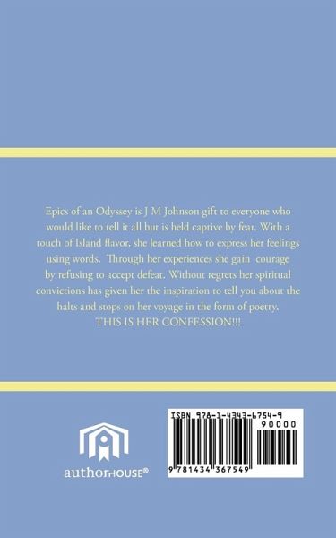 Epics of an Odyssey "1" is J. M. Johnsons' gift to everyone who would like to share their thoughts but is held captive by fear. With a touch of Island flavor, she learned how to express her feelings using words. Through her experiences she gain courage by refusing to accept defeat. Without regrets her spiritual convictions has given her the inspiration to tell you about the halts and stops on her voyage in the form of poetry. THIS IS HER CONFESSIONS!!!
