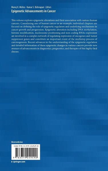 1. Role of DNA methylation in the progression and clearance of cancer.- 2. Epigenetical role for RNA in cancer progression.- 3. Epigenetics and its role in prostate cancer.- 4. Epigenetics and ovarian cancer.- 5. Epigenetics and breast cancer.- 6. Epigenetics and thyroid cancer.- 7. Epigenetics and intestinal cancer.- 8. Epigenetics and lung cancer.- 9. Epigenetics and renal cancer.- 10. Epigenetics and cervical cancer.- 11. Epigenetical markers in cancer.- 12. Epigenetical role in pancreatic cancer.
