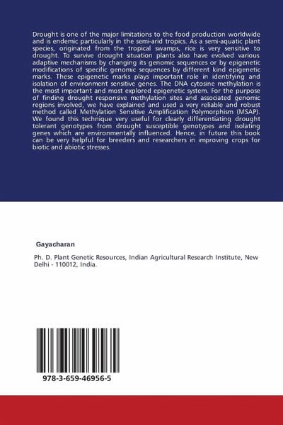 Drought is one of the major limitations to the food production worldwide and is endemic particularly in the semi-arid tropics. As a semi-aquatic plant species, originated from the tropical swamps, rice is very sensitive to drought. To survive drought situation plants also have evolved various adaptive mechanisms by changing its genomic sequences or by epigenetic modifications of specific genomic sequences by different kind epigenetic marks. These epigenetic marks plays important role in identifying and isolation of environment sensitive genes. The DNA cytosine methylation is the most important and most explored epigenetic system. For the purpose of finding drought responsive methylation sites and associated genomic regions involved, we have explained and used a very reliable and robust method called Methylation Sensitive Amplification Polymorphism (MSAP). We found this technique very useful for clearly differentiating drought tolerant genotypes from drought susceptible genotypes and isolating genes which are environmentally influenced. Hence, in future this book can be very helpful for breeders and researchers in improving crops for biotic and abiotic stresses.