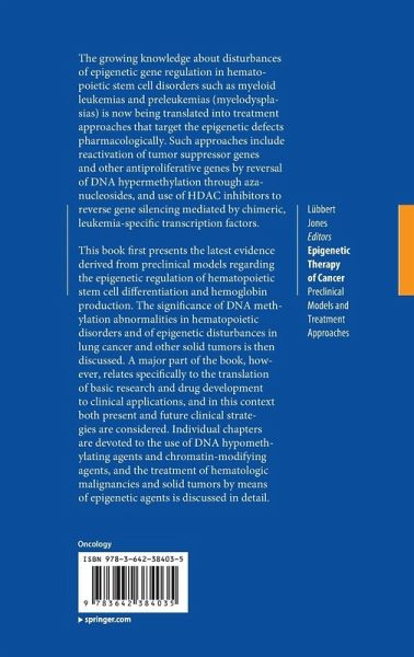 The growing knowledge about disturbances of epigenetic gene regulation in hematopoietic stem cell disorders is now being translated into treatment approaches that target the epigenetic defects pharmacologically. This book first presents the latest evidence regarding the epigenetic regulation of hematopoietic stem cell differentiation and hemoglobin production. The significance of DNA methylation abnormalities in hematopoietic disorders and of epigenetic disturbances in lung cancer and other solid tumors is then discussed. A major part of the book, however, relates specifically to the translation of basic research and drug development to clinical applications, and in this context both present and future clinical strategies are considered. Individual chapters are devoted to the use of DNA hypomethylating agents and chromatin-modifying agents, and the treatment of hematologic malignancies and solid tumors by means of epigenetic agents is discussed in detail.