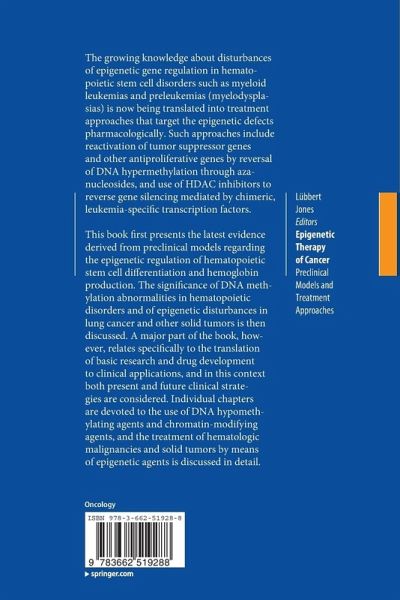 The growing knowledge about disturbances of epigenetic gene regulation in hematopoietic stem cell disorders is now being translated into treatment approaches that target the epigenetic defects pharmacologically. This book first presents the latest evidence regarding the epigenetic regulation of hematopoietic stem cell differentiation and hemoglobin production. The significance of DNA methylation abnormalities in hematopoietic disorders and of epigenetic disturbances in lung cancer and other solid tumors is then discussed. A major part of the book, however, relates specifically to the translation of basic research and drug development to clinical applications, and in this context both present and future clinical strategies are considered. Individual chapters are devoted to the use of DNA hypomethylating agents and chromatin-modifying agents, and the treatment of hematologic malignancies and solid tumors by means of epigenetic agents is discussed in detail.