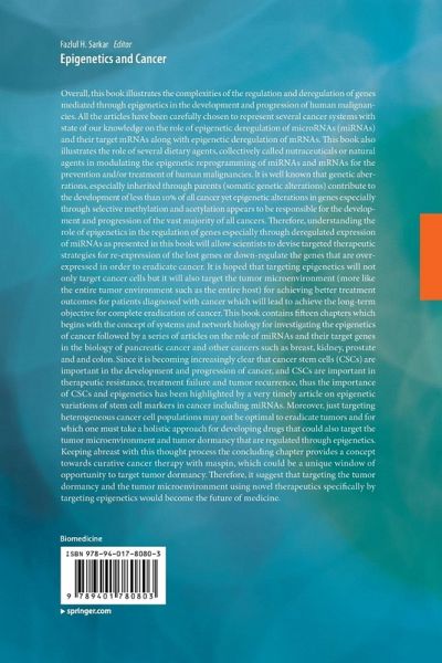 Overall, this book illustrates the complexities of the regulation and deregulation of genes mediated through epigenetics in the development and progression of human malignancies. All the articles have been carefully chosen to represent several cancer systems with state of our knowledge on the role of epigenetic deregulation of microRNAs (miRNAs) and their target mRNAs along with epigenetic deregulation of mRNAs. This book also illustrates the role of several dietary agents, collectively called nutraceuticals or natural agents in modulating the epigenetic reprogramming of miRNAs and mRNAs for the prevention and/or treatment of human malignancies. It is well known that genetic aberrations, especially inherited through parents (somatic genetic alterations) contribute to the development of less than 10% of all cancer yet epigenetic alterations in genes especially through selective methylation and acetylation appears to be responsible for the development and progression of the vast majority of all cancers. Therefore, understanding the role of epigenetics in the regulation of genes especially through deregulated expression of miRNAs as presented in this book will allow scientists to devise targeted therapeutic strategies for re-expression of the lost genes or down-regulate the genes that are over-expressed in order to eradicate cancer. It is hoped that targeting epigenetics will not only target cancer cells but it will also target the tumor microenvironment (more like the entire tumor environment such as the entire host) for achieving better treatment outcomes for patients diagnosed with cancer which will lead to achieve the long-term objective for complete eradication of cancer. This book contains fifteen chapters which begins with the concept of systems and network biology for investigating the epigenetics of cancer followed by a series of articles on the role of miRNAs and their target genes in the biology of pancreatic cancer and other cancers such as breast, kidney, prostate and and colon. Since it is becoming increasingly clear that cancer stem cells (CSCs) are important in the development and progression of cancer, and CSCs are important in therapeutic resistance, treatment failure and tumor recurrence, thus the importance of CSCs and epigenetics has been highlighted by a very timely article on epigenetic variations of stem cell markers in cancer including miRNAs. Moreover, just targeting heterogeneous cancer cell populations may not be optimal to eradicate tumors and for which one must take a holistic approach for developing drugs that could also target the tumor microenvironment and tumor dormancy that are regulated through epigenetics. Keeping abreast with this thought process the concluding chapter provides a concept towards curative cancer therapy with maspin, which could be a unique window of opportunity to target tumor dormancy. Therefore, it suggest that targeting the tumor dormancy and the tumor microenvironment using novel therapeutics specifically by targeting epigenetics would become the future of medicine.