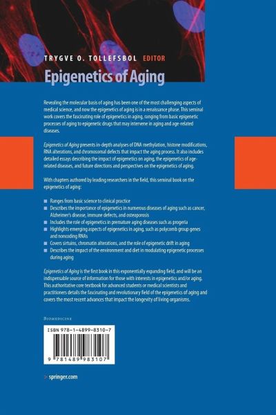 Recent studies have indicated that epigenetic processes may play a major role in both cellular and organismal aging. These epigenetic processes include not only DNA methylation and histone modifications, but also extend to many other epigenetic mediators such as the polycomb group proteins, chromosomal position effects, and noncoding RNA. The topics of this book range from fundamental changes in DNA methylation in aging to the most recent research on intervention into epigenetic modifications to modulate the aging process. The major topics of epigenetics and aging covered in this book are: 1) DNA methylation and histone modifications in aging; 2) Other epigenetic processes and aging; 3) Impact of epigenetics on aging; 4) Epigenetics of age-related diseases; 5) Epigenetic interventions and aging: and 6) Future directions in epigenetic aging research.