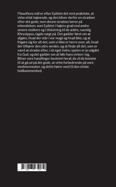 Filosofiens mål er efter Epiktet det rent praktiske, at virke etisk højnende, og den bliver derfor en stræben efter det gode; men denne stræben beror på erkendelsen, som Epiktet i højere grad end andre senere stoikere og i tilslutning til de ældre, navnlig Khrysippos, lagde vægt på. Det gælder først om at afgøre, hvad der står i vor magt og hvad ikke, og at frigøre sig for alt det, som vi ikke er herre over, alt, hvad der tilhører den ydre verden, og at finde alt det, som er værd at stræbe efter, i sit eget indre; sjælen er jo udgået fra Gud, og det gælder om at føle hans virken i sig. Bliver…mehr