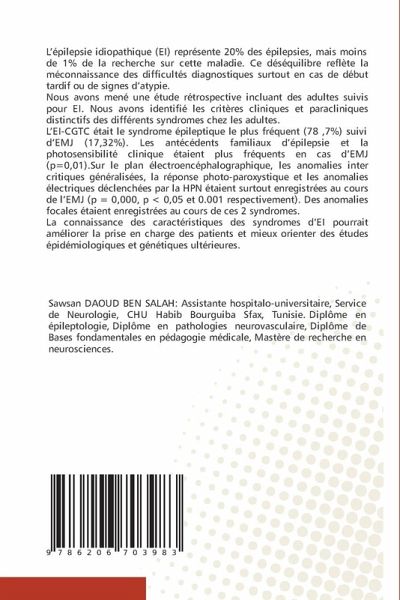 L'épilepsie idiopathique (EI) représente 20% des épilepsies, mais moins de 1% de la recherche sur cette maladie. Ce déséquilibre reflète la méconnaissance des difficultés diagnostiques surtout en cas de début tardif ou de signes d'atypie.Nous avons mené une étude rétrospective incluant des adultes suivis pour EI. Nous avons identifié les critères cliniques et paracliniques distinctifs des différents syndromes chez les adultes.L'EI-CGTC était le syndrome épileptique le plus fréquent (78 ,7%) suivi d'EMJ (17,32%). Les antécédents familiaux d'épilepsie et la photosensibilité clinique étaient plus fréquents en cas d'EMJ (p=0,01).Sur le plan électroencéphalographique, les anomalies inter critiques généralisées, la réponse photo-paroxystique et les anomalies électriques déclenchées par la HPN étaient surtout enregistrées au cours de l'EMJ (p = 0,000, p < 0,05 et 0.001 respectivement). Des anomalies focales étaient enregistrées au cours de ces 2 syndromes. La connaissance des caractéristiques des syndromes d'EI pourrait améliorer la prise en charge des patients et mieux orienter des études épidémiologiques et génétiques ultérieures.