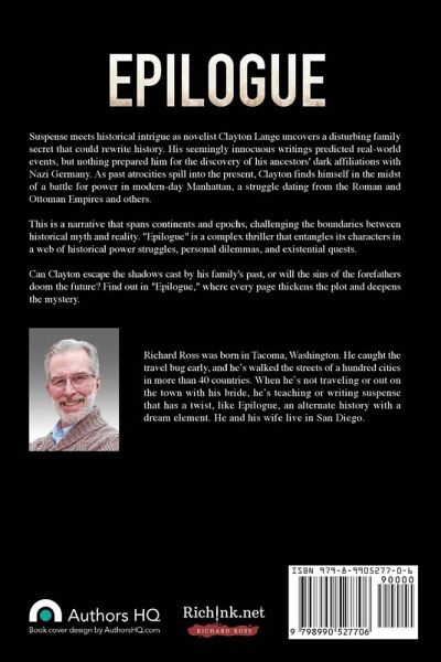 Suspense meets historical intrigue as novelist Clayton Lange uncovers a disturbing family secret that could rewrite history. His seemingly innocuous writings predicted real-world events, but nothing prepared him for the discovery of his ancestors' dark affiliations with Nazi Germany. As past atrocities spill into the present, Clayton finds himself in the midst of a battle for power in modern-day Manhattan, a struggle dating from the Roman and Ottoman Empires and others. This is a narrative that spans continents and epochs, challenging the boundaries between historical myth and reality. "Epilogue" is a complex suspense, thriller that entangles its characters in a web of historical power struggles, personal dilemmas, and existential quests. Can Clayton escape the shadows cast by his family's past, or will the sins of the forefathers doom the future? Find out in "Epilogue," where every page thickens the plot and deepens the mystery with lots of action and adventure.