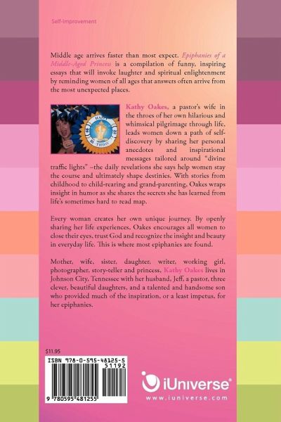 Middle age arrives faster than most expect. Epiphanies of a Middle-Aged Princess is a compilation of funny, inspiring essays that will invoke laughter and spiritual enlightenment by reminding women of all ages that answers often arrive from the most unexpected places. Kathy Oakes, a pastor's wife in the throes of her own hilarious and whimsical pilgrimage through life, leads women down a path of self-discovery by sharing her personal anecdotes and inspirational messages tailored around "divine traffic lights"-the daily revelations she says help women stay the course and ultimately shape destinies. With stories from childhood to child-rearing and grand-parenting, Oakes wraps insight in humor as she shares the secrets she has learned from life's sometimes hard to read map. Every woman creates her own unique journey. By openly sharing her life experiences, Oakes encourages all women to close their eyes, trust God and recognize the insight and beauty in everyday life. This is where most epiphanies are found.
