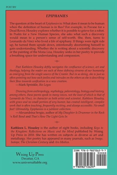 The question at the heart of Epiphanies is: What does it mean to be human when the definition of human is in flux? For example, in Pavane for a Dead Rover, Housley explores whether it is possible to grieve for a robot. In Psalm for a New Human Species, she asks what such a discovery would mean to a person's sense of self-worth. She, then, turns to Leonardo da Vinci who lived a life of epiphany. If things were right side up, he turned them upside down, intentionally disorienting himself to gain understanding. Whether she is writing about a scientific discovery or the painting of the Mona Lisa, Housley seeks in her poetry to provide a breathing space for understanding and compassion. --Kathleen L. Housley is the author of eight books. Her poetry has appeared in many journals, such as Image, Isotope, The Christian Century and Ars Medica. --"Poet Kathleen Housley deftly navigates the confluence of science, art and theology, helping the reader see each of those defining streams of our humanity as emerging from the single source of the Creator. But in so doing, she is just as often pointing out how each jostles and intrudes on the others as she is describing their flow towards unification in a new creation."-Mark Sprinkle, Bio Logos --"Drawing from anthropology, mythology, paleontology, biology and history, among others, these poems speak in many voices, not the least of which is that of Leonardo da Vinci, in character as both artist and scientist. Kathleen Housley, with grace and no small portion of wry humor, has created intelligent, complex work that is often touching, frequently exciting, and always accessible. No small feat! Ultimately, Epiphanies is a jubilant collection."-Alexandrina Sergio, author of My Daughter Is Drummer in the Rock 'n Roll Band and That's How The Light Gets In