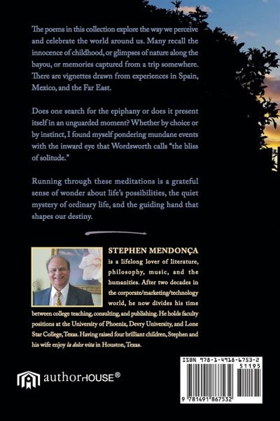 The poems in this collection explore the way we perceive and celebrate the world around us. Many recall the innocence of childhood, or glimpses of nature along the bayou, or memories captured from a trip somewhere. There are vignettes drawn from experiences in Spain, Mexico, and the Far East. Does one search for the epiphany or does it present itself in an unguarded moment? Whether by choice or by instinct, I found myself pondering mundane events with the inward eye that Wordsworth calls "the bliss of solitude." Running through these meditations is a grateful sense of wonder about life's possibilities, the quiet mystery of ordinary life, and the guiding hand that shapes our destiny.