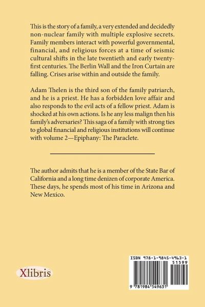 This is the story of a family, a very extended and decidedly non-nuclear family with multiple explosive secrets. Family members interact with powerful governmental, financial, and religious forces at a time of seismic cultural shifts in the late twentieth and early twenty-first centuries. The Berlin Wall and the Iron Curtain are falling. Crises arise within and outside the family. Adam Thelen is the third son of the family patriarch, and he is a priest. He has a forbidden love affair and also responds to the evil acts of a fellow priest. Adam is shocked at his own actions. Is he any less malign then his family's adversaries? This saga of a family with strong ties to global, religious, and financial institutions will continue with volume 2-Epiphany: The Paraclete.