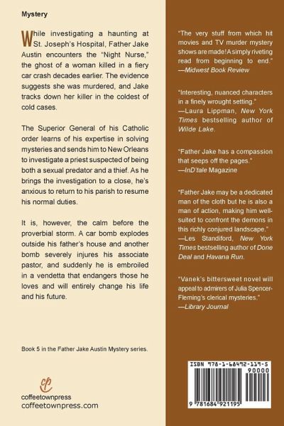 While investigating a haunting at St. Joseph's Hospital, Father Jake Austin encounters the "Night Nurse," the ghost of a woman killed in a fiery car crash decades earlier. The evidence suggests she was murdered, and Jake tracks down her killer in the coldest of cold cases. The Superior General of his Catholic order learns of his expertise in solving mysteries and sends him to New Orleans to investigate a priest suspected of being both a sexual predator and a thief. As he brings the investigation to a close, he's anxious to return to his parish to resume his normal duties. It is, however, the calm before the proverbial storm. A car bomb explodes outside his father's house and another bomb severely injures his associate pastor, and suddenly he is embroiled in a vendetta that endangers those he loves and will entirely change his life and his future.