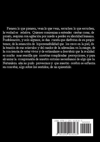 Piensen lo que piensen, vean lo que vean, escuchen lo que escuchen, la verdad es relativa. Quienes comienzan a entender ciertas cosas, de pronto, respiran con agitación por miedo a perder su identidad humana. Posiblemente, y solo algunos, se dan cuenta que disfrutan de su propio temor, de la sensación de hipersensibilidad que les crece en la piel, de la tensión de sus músculos y del candor de la adrenalina en la sangre, de la conciencia de estar vivos y de estimularse a descubrir que la realidad es mucho mas sencilla que nuestras complicadas percepciones, y para alcanzar la comprensión de nuestro entorno necesitamos de algo que la naturaleza aún no pudo proveernos y que nuestro cerebro se esfuerza en concebir, algo sobre los sentidos, de un episentido.