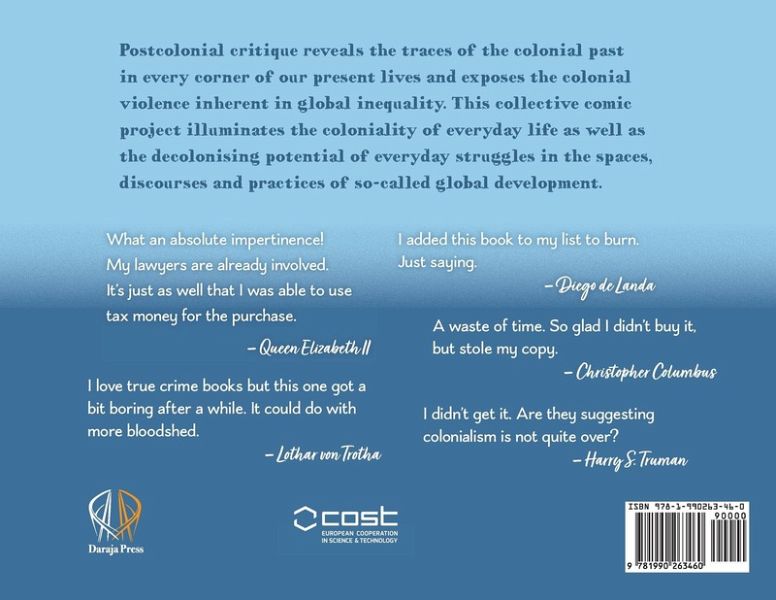 Post-/Decolonial critique exposes and deconstructs global inequality in its epistemic and material dimensions. However, this knowledge tends to hide in universities and in abstract, inaccessible theoretical texts. This collective comic project deals with postcolonial critique of global inequality in everyday life in the spaces, discourses and practices of so-called 'global development'. Our project illuminates everyday life's postcoloniality as well as the decolonising potential of everyday struggles. It does so by focusing on (settler)colonial history, but also on recent interventions, for instance, by development experts. With the medium of comics, we want to tell such critical perspectives in a visualised form and by using everyday stories as examples, thus overcoming textual boundaries. Our project develops a combination of individual, interconnected narratives of non-fiction comics, along which we present thematic fields and perspectives of postcolonial critique of global inequality. The combination of the formats of comic and non-fictional research-based insights makes it possible to convey reality while at the same time using the literary freedom of a graphic novel to convey postcolonial critique in a more lively and humorous way than a purely factual comic could. Our project thus puts complex theoretical concepts into story form, making them tangible. The comic stories are developed by academics and activists engaged in postcolonial critiques of global inequality. For each story, different artists/illustrators connected to the geographical and political context of the story works with the academics/activists to transform the story into a comic strip.