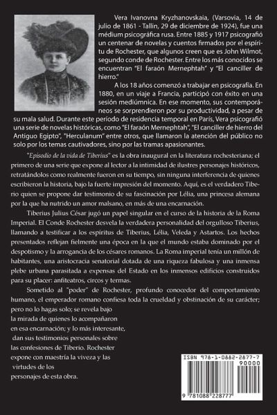 Episodio de la vida de Tiberius es la obra inaugural en la literatura rochesteriana; el primero de una serie que expone al lector a la intimidad de ilustres personajes históricos, retratándolos como realmente fueron en su tiempo, sin ninguna interferencia de quienes escribieron la historia, bajo la fuerte impresión del momento. Aquí, es el verdadero Tiberio quien se propone dar testimonio de su fascinación por Lélia, una princesa alemana por la que ha nutrido un amor malsano, en más de una encarnación. Tiberius Julius César jugó un papel singular en el curso de la historia de la Roma Imperial. El Conde Rochester desvela la verdadera personalidad del orgulloso Tiberius, llamando a testificar a los espíritus de Tiberius, Lélia, Veleda y Astartos. Los hechos presentados reflejan fielmente una época en la que el mundo estaba dominado por el despotismo y la arrogancia de los césares romanos. La Roma imperial tenía un millón de habitantes, una aristocracia senatorial dotada de una riqueza fabulosa y una inmensa plebe urbana parasitada a expensas del Estado en los inmensos edificios construidos para su placer: anfiteatros, circos y termas. Sometido al "poder" de Rochester, profundo conocedor del comportamiento humano, el emperador romano confiesa toda la crueldad y obstinación de su carácter; pero no lo hagas solo; se revela bajo la mirada de quienes lo acompañaron en esa encarnación; y lo más interesante, dan sus testimonios personales sobre las confesiones de Tiberio. Rochester expone con maestría la viveza y las virtudes de los personajes de esta obra.