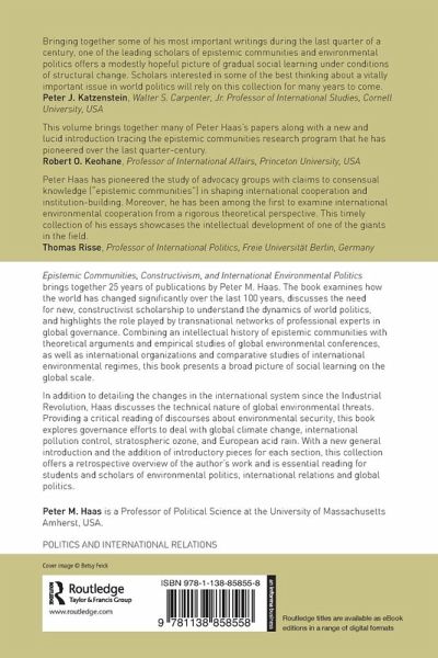 Epistemic Communities, Constructivism and International Environmental Politics brings together 25 years of publications by Peter M. Haas. The book examines how the world has changed significantly over the last 100 years, discusses the need for new, constructivist scholarship to understand the dynamics of world politics, and highlights the role played by transnational networks of professional experts in global governance. Combining an intellectual history of epistemic communities with theoretical arguments and empirical studies of global environmental conferences, as well as international organizations and comparative studies of international environmental regimes, this book presents a broad picture of social learning on the global scale. In addition to detailing the changes in the international system since the Industrial Revolution, Haas discusses the technical nature of global environmental threats. Providing a critical reading of discourses about environmental security, this book explores governance efforts to deal with global climate change, international pollution control, stratospheric ozone, and European acid rain. With a new general introduction and the addition of introductory pieces for each section, this collection offers a retrospective overview of the author's work and is essential reading for students and scholars of environmental politics, international relations and global politics.