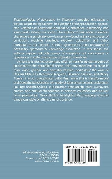 Epistemologies of Ignorance provide educators a distinct epistemological view on questions of marginalization, oppression, relations of power and dominance, difference, philosophy, and even death among our youth. The authors of this edited collection challenge the ambivalence - ignorance - found in the construction of curriculum, teaching practices, research guidelines, and policy mandates in our schools. Further, ignorance is also considered a necessary by-product of knowledge production. In this sense, the authors explore not only issues of complicity but also issues of oppression in spite of educators' liberatory intentions. While this is the first systematic effort to transfer epistemologies of ignorance to the educational scene, this movement has its roots in race, class, gender, and sexuality studies, particularly the work of Charles Mills, Eve Kosofsky Sedgwick, Shannon Sullivan, and Nancy Tuana. It is our unequivocal belief that, while this is transformative and powerful scholarship, the study of ignorance remains understudied and under-theorized in education scholarship, from curriculum studies and cultural foundations to science education and educational psychology. This collection highlights without apology why this dangerous state of affairs cannot continue.