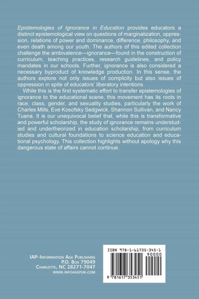 Epistemologies of Ignorance provide educators a distinct epistemological view on questions of marginalization, oppression, relations of power and dominance, difference, philosophy, and even death among our youth. The authors of this edited collection challenge the ambivalence - ignorance - found in the construction of curriculum, teaching practices, research guidelines, and policy mandates in our schools. Further, ignorance is also considered a necessary by-product of knowledge production. In this sense, the authors explore not only issues of complicity but also issues of oppression in spite of educators' liberatory intentions. While this is the first systematic effort to transfer epistemologies of ignorance to the educational scene, this movement has its roots in race, class, gender, and sexuality studies, particularly the work of Charles Mills, Eve Kosofsky Sedgwick, Shannon Sullivan, and Nancy Tuana. It is our unequivocal belief that, while this is transformative and powerful scholarship, the study of ignorance remains understudied and under-theorized in education scholarship, from curriculum studies and cultural foundations to science education and educational psychology. This collection highlights without apology why this dangerous state of affairs cannot continue.