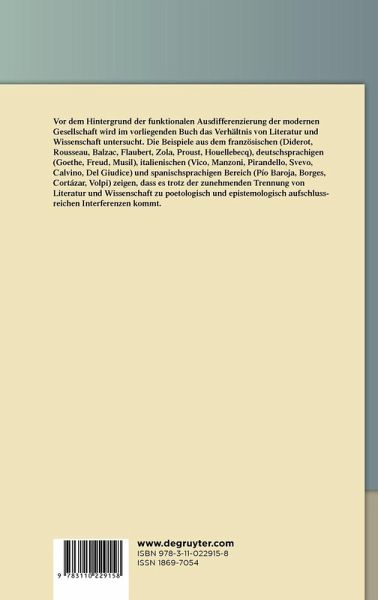 Vor dem Hintergrund der im 18. Jahrhundert erstmals manifest werdenden funktionalen Ausdifferenzierung der modernen Gesellschaft wird das Verhältnis zwischen Literatur und Wissenschaft an Beispielen aus dem französischen (Diderot, Rousseau, Balzac, Flaubert, Zola, Proust, Houellebecq), deutschsprachigen (Goethe, Freud, Musil), italienischen (Vico, Manzoni, Pirandello, Svevo, Calvino, Del Giudice) und spanischsprachigen Bereich (Pío Baroja, Borges, Cortázar, Volpi) untersucht.