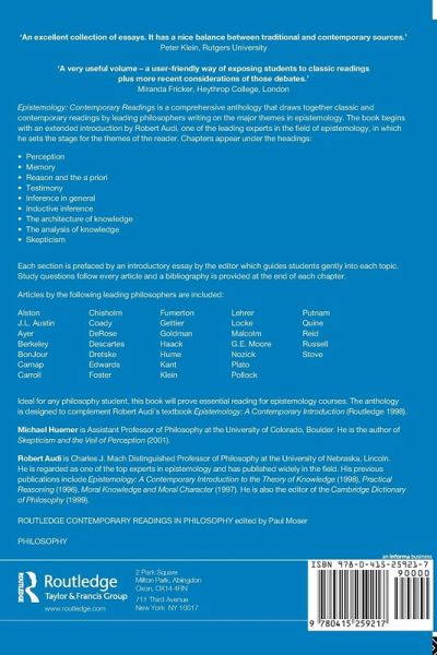 This comprehensive anthology draws together classic and contemporary readings by leading philosophers on epistemology. Ideal for any philosophy student, it will prove essential reading for epistemology courses, and is designed to complement Robert Audi's textbook Epistemology: A Contemporary Introduction (Routledge, 1998).