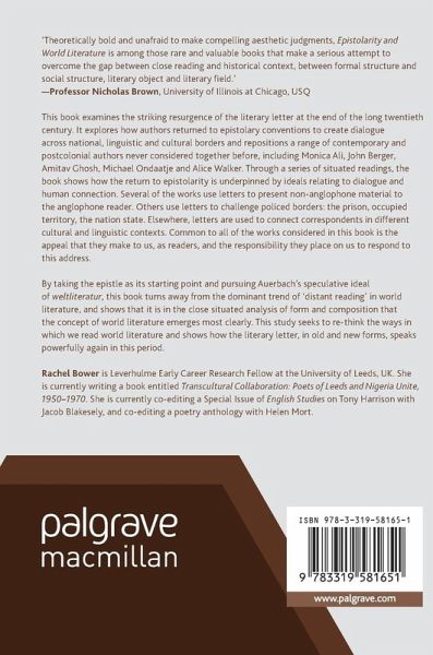 "Rachel Bower's Epistolarity and World Literature maintains a sustained focus on the resurgence of epistolary elements in recent Anglophone fiction. This turns out to be a remarkably productive methodological choice. ... The book is a masterful performance of comparative generosity, a generosity it shares with the some of the best world literature scholarship out there, or indeed with the cosmopolitan intellectual tradition the field updates." (Pieter Vermeulen, English Studies, November 27, 2018)