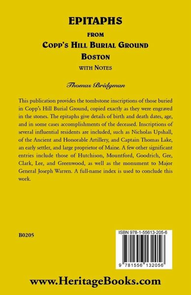 This publication provides the tombstone inscriptions of those buried in Copp's Hill Burial Ground, copied exactly as they were engraved in the stones. The epitaphs give details of birth and death dates, age, and in some cases accomplishments of the deceased. Inscriptions of several influential residents are included, such as Nicholas Upshall, of the Ancient and Honorable Artillery, and Captain Thomas Lake, an early settler, and large proprietor of Maine. A few other significant entries include those of Hutchison, Mountford, Goodrich, Gee, Clark, Lee, and Greenwood, as well as the monument to Major General Joseph Warren. A full-name index is used to conclude this work.