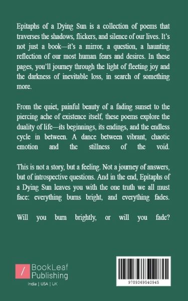 Epitaphs of a Dying Sun is a collection of poems that explore the raw beauty and inevitable decay of existence. With haunting imagery and philosophical depth, these verses navigate the contrasts between life's fleeting vibrancy and its silent, fading end. From the flicker of joy to the weight of loss, this book delves into the human experience, asking questions without offering answers. It's a journey through light, shadow, and everything in between-challenging readers to reflect on what it means to live, love, and ultimately, fade.