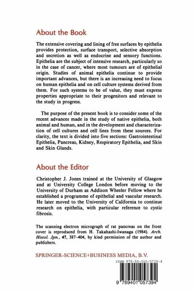 Epithelial cells probably constitute the most diverse group of cells found in the body. In addition to serving as interfaces between external and internal environments, their functions include ion and fluid secretion and reabsorp tion, protein exocytosis, hormone secretion, recognition, surface protection and the control of ciliary movement. By their very exposure on the surfaces of the body, epithelial cells are subjected to wide-ranging assault, by micro organisms and by chemical and physical forces. They are the targets for abrasion, infection and malignant transformation. Some epithelial cells show altered behaviour in inherited syndromes, such as cystic fibrosis, characterized by serious pancreatic and pulmonary disease. In view of the importance of epithelia and the fact that their function can be altered by environmental and inherited factors, they are the subject of intensive research, particularly so in the case of cancer where most tumours are of epithelial origin. The use of animal tissues in epithelial research continues to provide important advances and this, coupled with the need to focus more on human tissues, has prompted a greater research emphasis on accessible human epithelia and on the establishment of cell cultures from animal and human sources. For primary cell cultures and cell lines to be of value, they need to express properties appropriate to their progenitors and relevant to the study in progress.