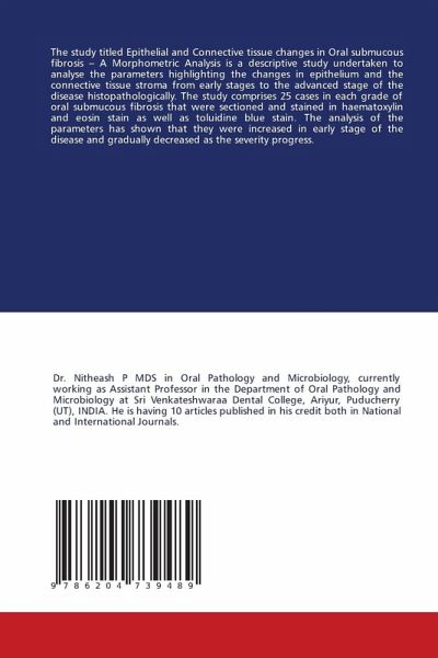 The study titled Epithelial and Connective tissue changes in Oral submucous fibrosis - A Morphometric Analysis is a descriptive study undertaken to analyse the parameters highlighting the changes in epithelium and the connective tissue stroma from early stages to the advanced stage of the disease histopathologically. The study comprises 25 cases in each grade of oral submucous fibrosis that were sectioned and stained in haematoxylin and eosin stain as well as toluidine blue stain. The analysis of the parameters has shown that they were increased in early stage of the disease and gradually decreased as the severity progress.