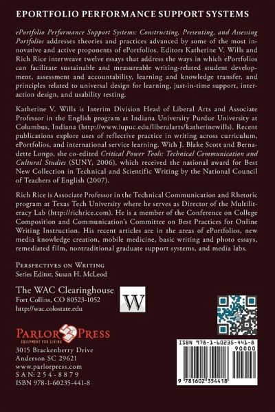 New Perspectives on Writing Series Editor: Susan H. McLeod EPORTFOLIO PERFORMANCE SUPPORT SYSTEMS: CONSTRUCTING, PRESENTING, AND ASSESSING PORTFOLIOS addresses theories and practices advanced by some of the most innovative and active proponents of ePortfolios. Editors KATHERINE V. WILLS and RICH RICE interweave twelve essays that address the ways in which ePortfolios can facilitate sustainable and measureable writing-related student development, assessment and accountability, learning and knowledge transfer, and principles related to universal design for learning, just-in-time support, interaction design, and usability testing. ABOUT THE EDITORS: KATHERINE V. WILLS is Interim Division Head of Liberal Arts and Associate Professor in the English program at Indiana University Purdue University at Columbus, Indiana. Recent publications explore uses of reflective practice in writing across curriculum, ePortfolios, and International service learning. With J. Blake Scott and Bernadette Longo, she co-edited Critical Power Tools: Technical Communication and Cultural Studies (SUNY, 2006), which received the national award for Best New Collection in Technical and Scientific Writing by the National Council of Teachers of English (2007). RICH RICE is Associate Professor in the Technical Communication and Rhetoric program at Texas Tech University where he serves as Director of the Multiliteracy Lab. He is a member of the Conference on College Composition and Communication's Committee on Best Practices for Online Writing Instruction. His recent articles are in the areas of ePortfolios, new media knowledge creation, mobile medicine, basic writing and photo essays, remediated film, nontraditional graduate support systems, and media labs.