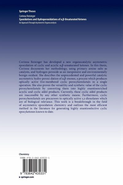 Corinna Reisinger has developed a new organocatalytic asymmetric epoxidation of cyclic and acyclic ,beta-unsaturated ketones. In this thesis, Corinna documents her methodology, using primary amine salts as catalysts, and hydrogen peroxide as an inexpensive and environmentally benign oxidant. She describes the unprecedented and powerful catalytic asymmetric hydroperoxidation of ,beta-enones, a process which produces optically active five-membered cyclic peroxyhemiketals in a single operation. She also proves the versatility and synthetic value of the cyclic peroxyhemiketals by converting them into highly enantioenriched acyclic and cyclic aldol products. Currently, these cyclic aldol products are inaccessible by any other synthetic means. Furthermore, cyclic peroxyhemiketals are precursors to optically active 1,2-dioxolanes which are of biological relevance. This work is a breakthrough in the field of asymmetric epoxidation chemistry and outlines the most efficient method inthe literature for generating highly enantioselective cyclic epoxyketones known to date.