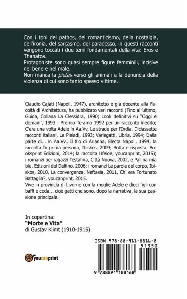 Con i toni del pathos, del romanticismo, della nostalgia, dell'ironia, del sarcasmo, del paradosso, in questi racconti vengono toccati i due temi fondamentali della vita: Eros e Thanatos. Protagoniste sono quasi sempre fi gure femminili, incisive nel bene e nel male. Non manca la pietas verso gli animali e la denuncia della violenza di cui sono tanto spesso vittime.