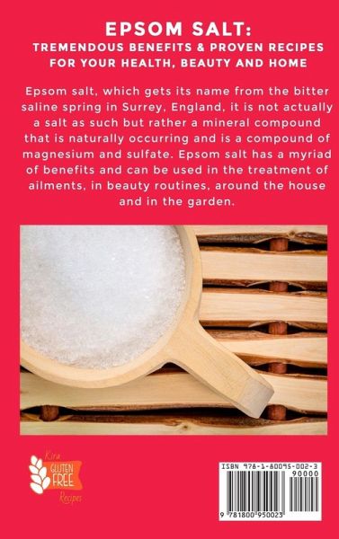 Discover the Tested Secrets & Uses of Epsom Salt to Achieve a Healthy Lifestyle, Relax and Take Care of Your Home! 100% Natural Recipes Included to Guide You Step-by-Step! Epsom salt is a phenomenal mineral with a myriad of health and wellness benefits you are just about to experience yourself. Epsom salt can be effectively used in the treatment of ailments, in natural beauty routines, around the house and even in the garden. In this comprehensive Epsom salt guide you will discover practical tips & strategies that will help you create simple holistic solutions for your body and mind. Moreover, you will learn how you can use this multi-functional ingredient to create a beautiful garden and a healthier home! Epsom Salt- Tremendous Benefits & Proven Recipes for Your Health, Beauty and Home Will Teach You: -How to create your unique home spa-style bath recipes for mind and body relaxation & holistic detox. -How to relax and reduce inflammation & chronic pains with soothing Epsom salt remedies. -How to use Epsom Salt as an alternative to the commercial chemical-based cleaning products and insecticides in your home and garden. -How to combine Epsom Salt and Essential Oils: Discover the combination of these incredible health- boosting ingredients. -How to make amazing and effective beauty products using proven Epsom salt recipes and essential oils. Summing-up; you will learn how to actually save hundreds of dollars and lower the risk of allergies- no need to buy expensive commercial and chemical-laden products if you know how to use Epsom salt for your health, beauty and home! What are you waiting for? Start taking care of your mind and body in an all-natural way. With Epsom salt, you can prevent many allergies and ailments and give yourself the health and energy you deserve. The tips and recipes you are just about to discover are designed for modern busy and demanding people who want long-term health results and are looking for effective, practical solutions. Read, enjoy and apply! Order your copy now to learn more about the astonishing benefits of Epsom salt today! Simply scroll to the top of the page and select the orange 'buy button' to start reading now!