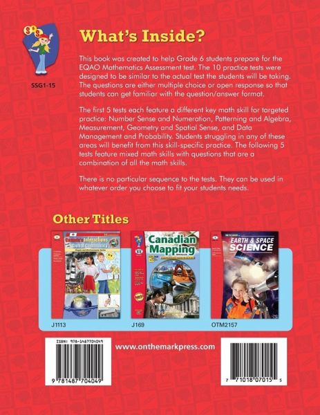 Created to help Grade 6 students prepare for the EQAO Mathematics Assessment Test. The 10 practice tests were designed to be similar to the actual test the students will be taking. The questions are either multiple choice or open response so that students can get familiar with the question/answer format. The first 5 tests each feature a different key math skill for targeted practice: number sense & numeration, patterning & algebra, measurement, geometry & spatial sense, and data management & probability. Students struggling in any of these areas will benefit from this skill-specific practice. The following 5 tests feature mixed math skills with questions that are a combination of all the math skills. There is no particular sequence to the tests. They can be used in whatever order you choose to fit your student's needs.