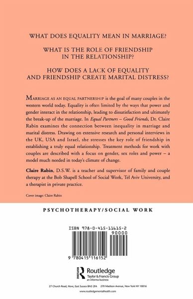 Marriage as an equal partnership is the goal of amny couples in the western world today and yet equality is often limited by the ways that power and gender interact in the relationship, leading to dissatisfaction and ultimately the break up of the marriage. In Equal PArtners - Good Friends Claire Rabin examines the connection between inequality in marriage and marital distress. Drawing on extensive research and personal interviews in the UK, USA and Israel, she stresses the role of friendship in establishing a truly equal relationship. Focusing on issues of gender, sex roles and power, she provides a new clinical treatment model for therapists working with couples which is much needed in today's climate of change.
