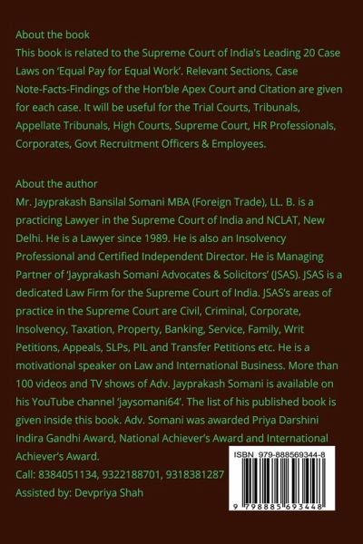 This book is related to the Supreme Court of India's Leading 20 Case Laws on 'Equal Pay for Equal Work'. Relevant Sections, Case Note-Facts-Findings of the Hon'ble Apex Court and Citation are given for each case. It will be useful for the Advocates of the Trial Courts, Tribunals, Appellate Tribunals, High Courts, Supreme Court, HR Professionals, Corporates, Govt Recruitment Officers & Employees. This book is containing a synopsis of 20 leading causes of the Apex Court. Following points are given for each leading case. 1. Name of the Case i. e. Cause title 2. Relevant Sections discussed in the case 3.Hon'ble Judges/Coram of the case 4. Number of PDF Pages in Original Judgement of the case 5. All available Citations of the case 6. Case Note with appeal allowed/ dismissed or disposed off 7. Facts of the case 8. Hon'ble Apex Court's findings, while dismissing/allowing or disposing off the appeal 9. Ratio Decidendi if any. Author: Jayprakash B. Somani, Advocate Supreme Court of India Assisted by: Devpriya Shah Call: 8384051134, 9322188701, 9318381287 Website:www.jayprakashsomani.com