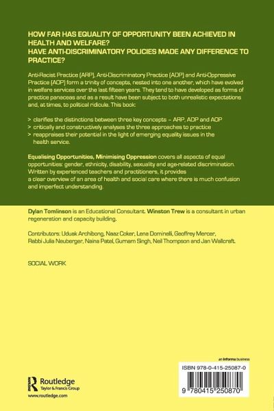 Anti-Racist Practice (ARP), Anti-Discriminatory Practice (ADP) and Anti-Oppressive Practice (AOP) form a trinity of concepts, nested into one another, which have evolved in welfare services over the last fifteen years. They tend to have developed as forms of practice panaceas and as a result have been subject to both unrealistic expectations and, at times, to political ridicule. This book clarifies the distinctions between three key concepts - ARP, ADP and AOP. Critically and constructively analysing these three approaches to practice it reappraises their potential in the light of emerging equality issues in the health service With contributions from leading teachers and practitioners in the field, Equalising Opportunities provides students and practitioners in health and social care with a clear overview of an area where there is much confusion and imperfect understanding.
