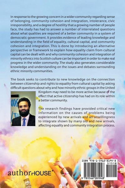 In response to the growing concern in a wider community regarding sense of belonging, community cohesion and integration, intolerance, civic irresponsibility, and a degree of hostility that a growing number of people face, the study has had to answer a number of interrelated questions about what qualities are required of a better community in a system of democratic government. It provides evidence of leading knowledge and understanding in the field of equality, cultural capital, and community cohesion and integration. This is done by introducing an alternative perspective or framework to explain how equality claim from cultural capital can be dealt with and why community cohesion and integration of minority ethnics into Scottish culture can be important in order to make real progress in the wider community. The study also generates considerable knowledge and understanding on the issues and debates surrounding ethnic minority communities. The book seeks to contribute to new knowledge on the connection between citizenship and rights to equality from cultural capital by asking difficult questions about why and how minority ethnic groups in the United Kingdom may need to be more active because of the effect that active citizenship has had on its role within a better community. The research findings have provided critical new information on the causes of problems being experienced by new arrivals and an unwillingness to integrate shown by many old and new arrivals, affecting equality and community integration process.