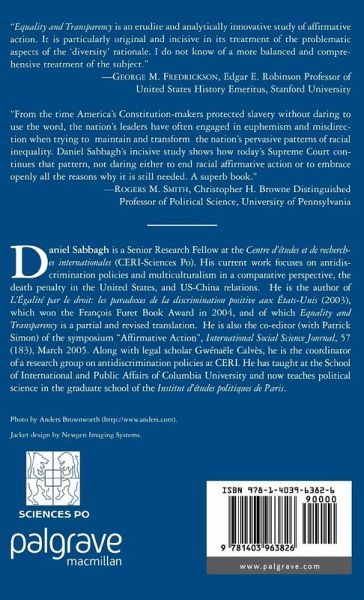 Can affirmative action policies be convincingly justified? And how have they been legitimized over time? In a pluridisciplinary perspective at the intersection of political theory and the sociology of law, Daniel Sabbagh criticizes the two prevailing justifications put forward in favor of affirmative action: the corrective justice argument and the diversity argument.He defends the policy instead as an instrument designed to bring about the deracialization of American society. In this respect, however, affirmative action requires a measure of dissimulation in order to succeed.Equality and Transparency explains why this is so and provides a new interpretation of the strategic component in the Supreme Court's case law while identifying some of its most remarkable side effects.