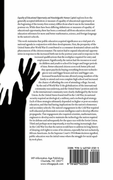 This work explores how the generally accepted definition or measure of equality of educational opportunity at the beginning of the twenty-first century differs from what it was in the immediate postwar era. While there have been differing definitions or measures of equality of educational opportunity, there has been a continual call from education critics and education reformers for more and better mathematics, science, and foreign language in the nation's schools. This work maintains that public education acquired significance as a vital part of a national agenda in conjunction with three developments. First, the prosperity of the United States after World War II contributed to a consumer dominated culture and the phenomenon of the citizenconsumer. The nation had to expand educational opportunities in response to the increased birth rate in the postwar years and in response to the increased qualifications that the workplace required for entry and employment. Significantly, the nation had the resources to send its children and youth to school for longer and longer periods of time. Better-educated citizens soon took better jobs and they spent paychecks buying everything from new technologies to new and bigger houses and new and bigger cars. Increased household income allowed young members of the family to attend and even complete high school and increased the chance of affording the cost of attending college. Second, by the end of World War II the globalization of the international community was underway, and the United States' position and role in the international community were clearly challenged by the Soviet Union. As the United States found itself in the Cold War, its national security required an ideological, a military, and a technological strategy. Each of these strategies ultimately depended on higher or post-secondary education, and that had lasting implications for the nation's elementary and secondary schools. The nation's engagement in the Cold War required well-educated professionals to secure intelligence and to develop effective propaganda. That engagement also required scientists, mathematicians, and engineers to develop and to maintain the technology the nation required for its defense and subsequently for the space race with the Soviet Union. Third and perhaps most importantly, it was becoming increasingly clear in the Cold War Era that the nation would have to address its long history of denying civil rights to some of its citizens, especially but not exclusively, African Americans. As the Supreme Court's 1954 Brown decision signified, public education was the initial venue where the struggle for racial equality took place.