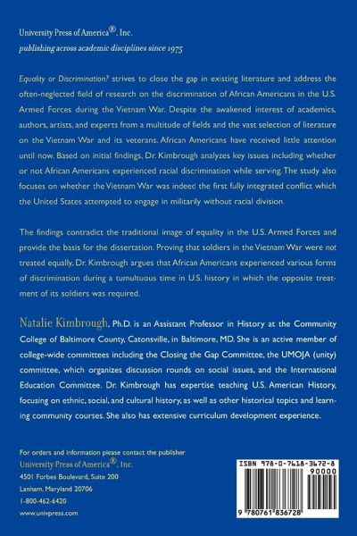 Equality or Discrimination? strives to close the gap in existing literature and address the often-neglected field of research on the discrimination of African Americans in the U.S. Armed Forces during the Vietnam War. Despite the awakened interest of academics, authors, artists, and experts from a multitude of fields and the vast selection of literature on the Vietnam War and its veterans, African Americans have received little attention until now. Based on initial findings, Dr. Kimbrough analyzes key issues including whether or not African Americans experienced racial discrimination while serving. The study also focuses on whether the Vietnam War was indeed the first fully integrated conflict in which the U.S. attempted to engage in militarily without racial division. The findings contradict the traditional image of equality in the U.S. Armed Forces and provide the basis for the dissertation. Proving that soldiers in the Vietnam War were NOT treated equally, Dr. Kimbrough argues that African Americans experienced various forms of discrimination during a tumultuous time in U.S. history in which the opposite treatment of its soldiers was required.