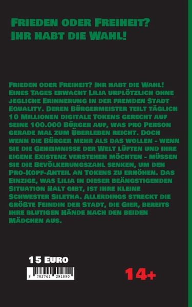 Frieden oder Freiheit? Ihr habt die Wahl!Eines Tages erwacht Lilia urplötzlich ohne jegliche Erinnerung in der fremden Stadt Equality.Deren Bürgermeister teilt täglich 10 Millionen digitale Tokens gerecht auf seine 100.000 Bürger auf, was pro Person gerade mal zum Überleben reicht. Doch wenn die Bürger mehr als das wollen - wenn sie die Geheimnisse der Welt lüften und ihre eigene Existenz verstehen möchten - müssen sie die Bevölkerungszahl senken, um den Pro-Kopf-Anteil an Tokens zu erhöhen.Das Einzige, was Lilia in dieser beängstigenden Situation Halt gibt, ist ihre kleine Schwester Siletha. Allerdings streckt die größte Feindin der Stadt, die Gier, bereits ihre blutigen Hände nach den beiden Mädchen aus.