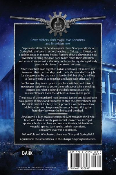 Grave robbers, dark magic, mad scientists, and forbidden love! Supernatural Secret Service agents Owen Sharps and Calvin Springfield are back in action, heading to Chicago to investigate a sudden spike in missing bodies. Rumors about a showman's new invention to bring the dead back to life catch their attention, and so do stories about a shadowy doctor replacing damaged body parts with pieces from stolen corpses. After their first case together, Calvin and Owen fell in love and discovered their partnership held true both on and off the job. It's dangerous to be two men in love in 1897, but they're willing to face any risk to be together and keep each other safe. In Chicago, they team up with psychics, witches, and intrepid newspaper reporters to get to the truth about who is stealing corpses and what's behind the dark intentions of the resurrectionists. Even the Mob has a stake in the game. The ghosts of the murdered men demand justice, and it's going to take plenty of magic and firepower to stop the graverobbers, end the illicit market for body parts, prevent a war between two Mob families, and keep a mad inventor from shifting the boundary between the living and the dead. Equalizer is a high-stakes steampunk MM romance thrill ride filled with found family, paranormal Pinkertons, intrepid reporters, body snatchers and resurrectionists, Mob witches, vengeful spirits, dark spells, unholy inventions, and a love that won't be denied. Before Colt and Winchester, there was Sharps & Springfield! Equalizer is the second book in the Sharps & Springfield series.