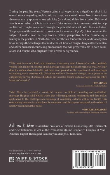 During the past fifty years, Western culture has experienced a significant shift in its overall stance regarding multiethnic marriage. As a result, more North Americans than ever marry spouses whose ethnicity (or culture) differs from theirs. This trend also is observable in Christian circles. Unfortunately, few resources exist to help multiethnic couples maneuver through the potential minefield of cultural collision. The purpose of this volume is to provide such a resource. Equally Yoked examines the subject of multiethnic marriage from a biblical perspective, before considering a history of the practice in North America over the last four centuries. Additionally, this book surveys the challenges that multiethnic Christian couples frequently encounter, and offers premarital counseling propositions that will prove valuable to both counselors and couples who originate from diverse backgrounds.