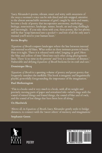 'Lucy Alexander's poems, vibrant, smart and witty with awareness of the ways a woman's voice can be side-lined and side-stepped, attentive to the almost untouchable meniscus of grief, caught by ideas and music, become a body of poetry that incorporates astronomy, mythology, biology, neuroscience, landscape, nature, breath, air and song thrillingly and knowingly. If you take them with you, these poems, like her phone, will be that 'wasp buttoned into a pocket'- and best of all the only user's manual you'll need is your human heart.' Kevin Brophy