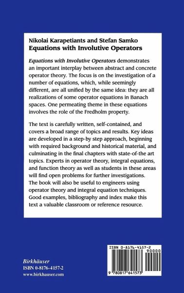 "Equations with Involutive Operators" demonstrates an important interplay between abstract and concrete operator theory. The focus is on the investigation of a number of equations, which, while seemingly different, are all unified by the same idea: they are all realizations of some operator equations in Banach spaces. One permeating theme in these equations involves the role of the Fredholm property. The text is carefully written, self-contained, and covers a broad range of topics and results. Key ideas are developed in a step-by-step approach, beginning with required background and historical material, and culminating in the final chapters with state-of-the art topics. Experts in operator theory, integral equations, and function theory as well as students in these areas will find open problems for further investigations. The book will also be useful to engineers using operator theory and integral equation techniques. Good examples, bibliography and index make this text a valuable classroom or reference resource.