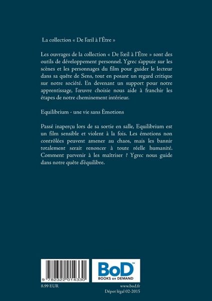 La collection « De l'oeil à l'Être »Les ouvrages de la collection « De l'oeil à l'Être » sont des outils de développement personnel. Ygrec s'appuie sur les scènes et les personnages du film pour guider le lecteur dans sa quête de Sens, tout en posant un regard critique sur notre société. En devenant un support pour notre apprentissage, l'oeuvre choisie nous aide à franchir les étapes de notre cheminement intérieur.Equilibrium - une vie sans ÈmotionsPassé inaperçu lors de sa sortie en salle, Equilibrium est un film sensible et violent à la fois. Les émotions non contrôlées peuvent amener au chaos, mais les bannir totalement serait renoncer à toute réelle humanité. Comment parvenir à les maîtriser ? Ygrec nous guide dans notre quête d'équilibre.