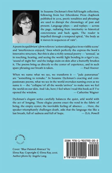 In Susanne Dyckman's first full-length collection, following from her Etherdome Press chapbook published in 2005, poetic tonalities and phrasings are used to disrupt the chronology of past and present. Language plays - and replays - across the page, radiating from interiority to historical concreteness and back again. The reader is impelled through a temporal spiral, "the body as it moves in sequences of rain". Born in Chicago, Susanne Dyckman has lived in cities on both coasts of the U.S., finally settling in Albany, California, where she curates the Evelyn Avenue reading series. She is the author of two chapbooks, Transiting Indigo (Etherdome Press) and Counterweight (Woodland Editions). Her writing has appeared in various publications, including Pomona Valley Review, Switchback, 26, Marginalia and First Intensity. After being named a recipient of the Five Fingers Review poetry award, she was invited to join the journal's editorial staff. She is currently a thesis advisor for the University of San Francisco's MFA in Writing program.
