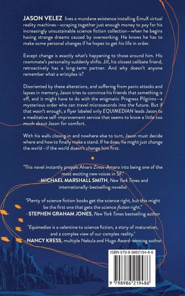 "Jason Velez lives a mundane existence installing EmuX virtual reality machines, scraping together just enough money to pay for his increasingly unsustainable science fiction collection, when he begins having strange dreams. He knows he has to make some personal changes if he hopes to get his life in order. Except change is exactly what's happening to those around him. His roommate's personality suddenly shifts. Jill, his closest single friend, retroactively has a long-term partner. And why doesn't anyone remember what a wristplex is? Disoriented by these alterations, and suffering from panic attacks and lapses in memory, Jason tries to convince his friends that something is off, and it might have to do with the enigmatic Progress Pilgrims--a mysterious order who can travel microseconds into the future. But if that wasn't enough, a flyer labeled only Equimedian leads Jason to a meditative self-improvement service that seems to know a little too much about Jason for comfort. With his walls closing in and nowhere else to turn, Jason must decide where and how to finally make a stand. If he does, he might just change the world--if the world doesn't change him first"--