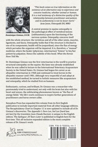 "This book comes as true information on the existence of an alternative way to experience and conceive medicine, whether animal or human. It is a real testimony of a distinctive quality of the relationship between practitioner and patient, and its authenticity is not its lesser merit." -Jean Josse, Osteopath DO, MRO A central premise in equine osteopathy is the pathological effect of vertebral lesions (subluxations) upon the functioning of the nervous system. Osteopathy concerns itself with the whole structure: the vertebrae and all of the other joints, muscles, ligaments, and fascia. Osteopathy holds that if the structure is blocked in one of its components, health will be jeopardized, since the flux of energy which pervades the organism will be impaired. It is therefore, a "manual" medicine, where the healer (physician, veterinarian) "listens" to his/her patient by palpation. Hence the subtitle of this book: What the Horses Have Told Me. Dr. Dominique Giniaux was the first veterinarian in the world to practice structural osteopathy on the equine. His fame was already established when he was called to lecture to the International Veterinary Acupuncture Society in the United States. Dr. Giniaux had begun his career as an allopathic veterinarian in 1968 and continued to treat horses in the allopathic manner until 1981. Although very respectful of and adept at the established method, he turned to holistic measures like acupuncture and osteopathy, which he studied first on humans. Enthusiastic, curious, and brilliant, Dr. Giniaux was a researcher who passionately tried to understand, not only with his brain but also with his heart and senses, the exhilarating phenomenon known as "the flux of energy fields." His life's work continues to inspire further generations of practitioners and horse owners alike. Xenophon Press has expanded this volume from its first English publication to include important material from all other language editions. The Recapitulatory Chart in Chapter 11 has been updated to include all of Dr. Giniaux's discoveries. The Appendix I: Dura Lex, Sed Lex (hard law, yet law) by the translator, Jean-Claude Racinet is unique to the English edition. The Epilogue: 20 Years later is published in English here for the first time. This all-inclusive expanded edition is the most complete release of Dr. Ginaux's work.
