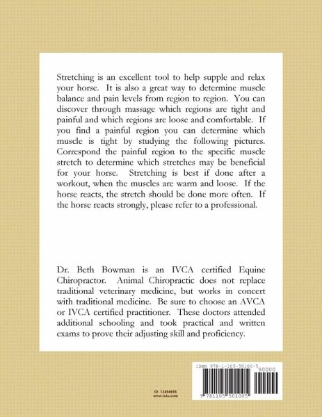 Stretching is an excellent tool to help supple and relax your horse. It is also a great way to determine muscle balance and pain levels from region to region. You can discover through massage which regions are tight and painful and which regions are loose and confortable. If you find a painful region correspond the region to the specific muscle stretch to determine which stretches may be beneficial for your horse. Stretching is best done after a workout when muscles are warm and loose. If the horse reacts stretches should be done more often. If the horse reacts strongly please refer to a professional.